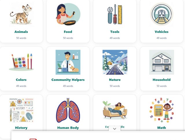 Choose a category—like Animals, Science, Math, or Around Town—to see colorful